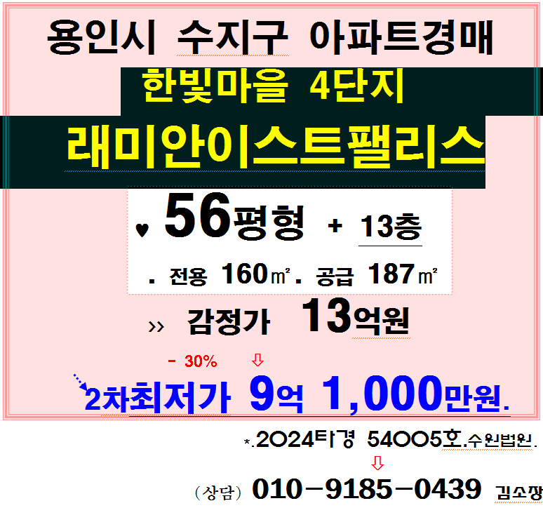 용인 수지구 아파트. 동천동 한빛마을 래미안이스트팰리스 4단지 56평형 2차경매(2024-54005)321 본문