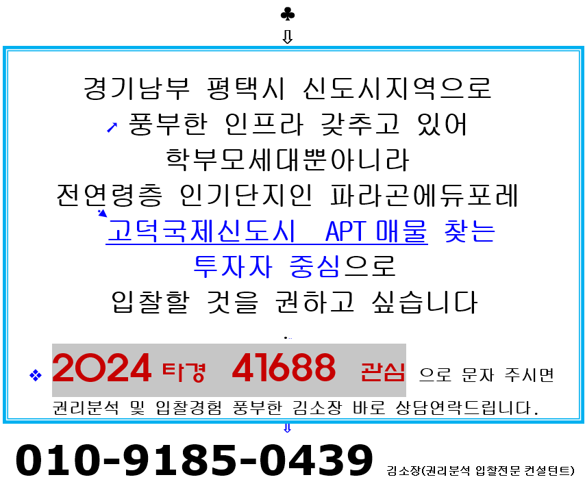 | 평택 학세권아파트.동삭동 평택센트럴자이 5단지 45평형 펜트하우스 2차경매(2024타경 41421)310 (0) | 2025.02.04 |