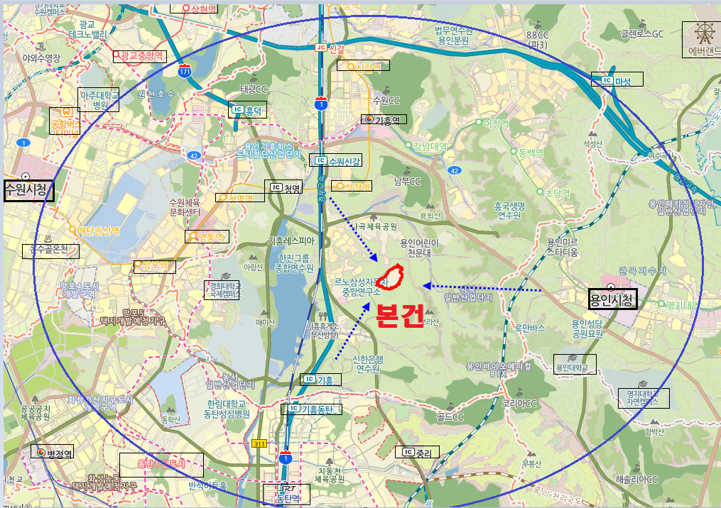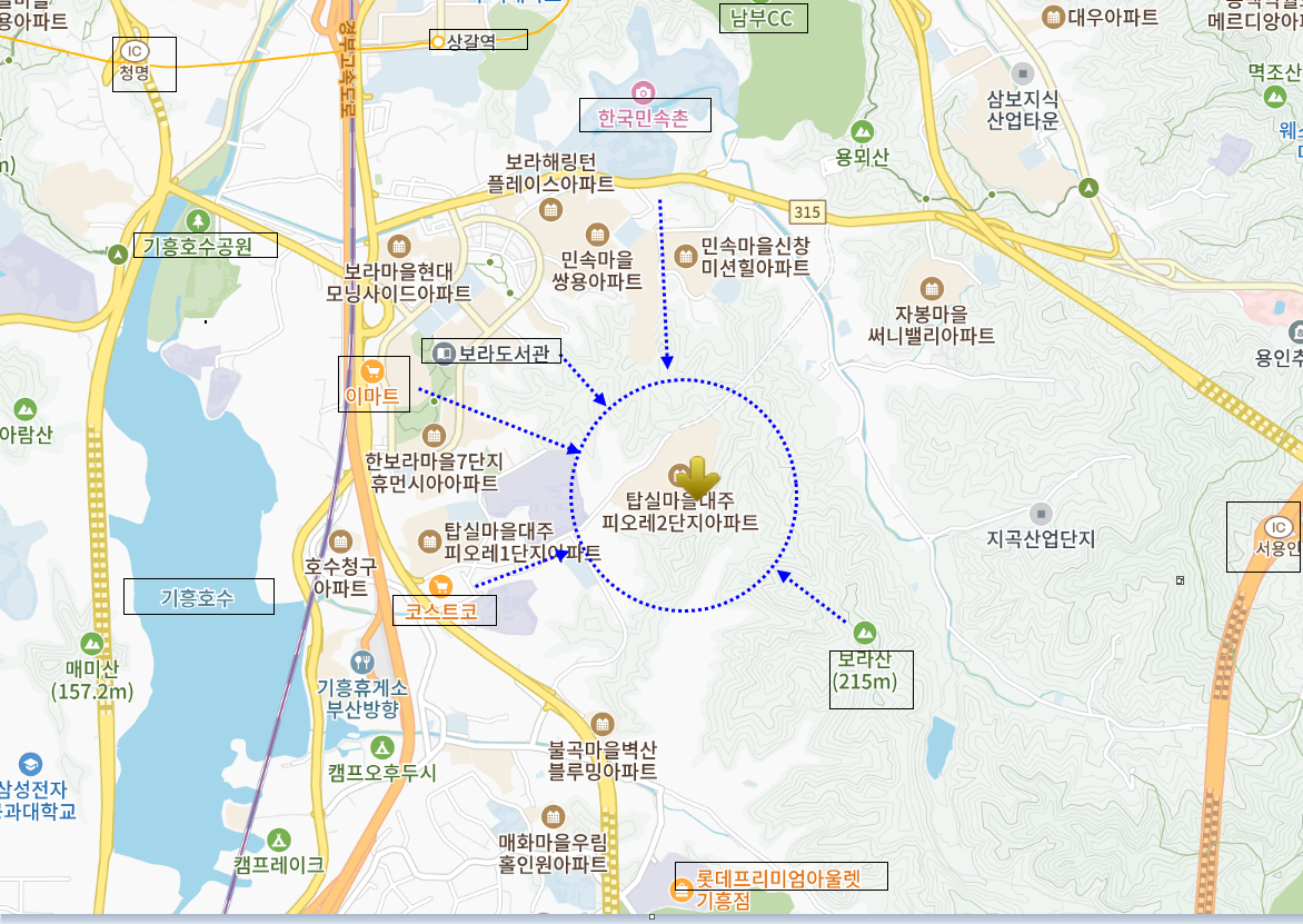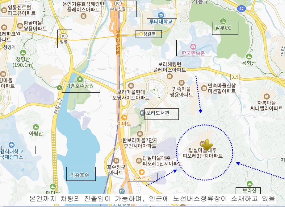 주변으로 보라지구, 수원 및 기흥IC,한국민속촌,