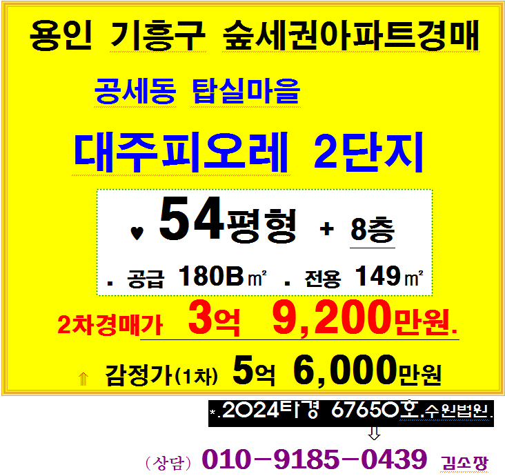 용인 기흥구 숲세권중형아파트. 공세동 탑실마을 대주피오레 2단지 54평형 2차경매(24-67650)530