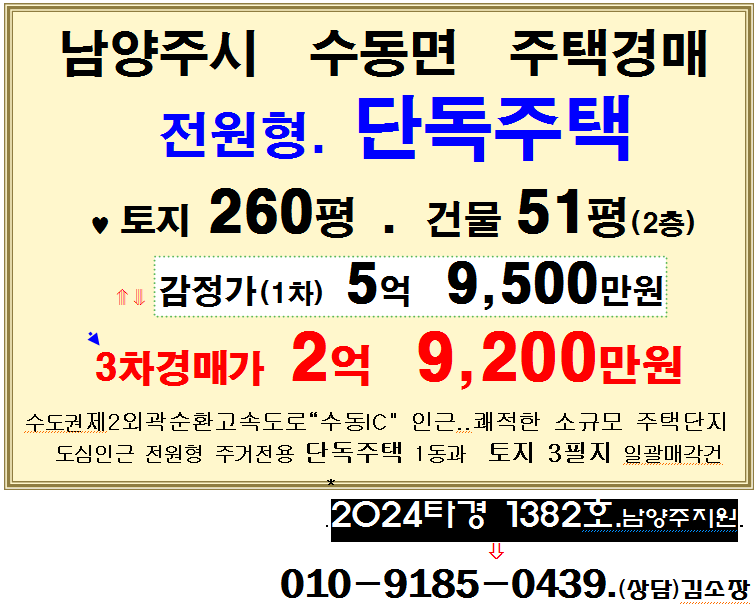 남양주시 전원주택 매각. 수동면 구운천변 2층 단독주택 3차경매(2024-1382)715 본문