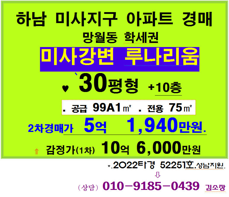 노란궁뎅이 2025. 8. 30. 12:48미사강변신도시 학세권아파트. 하남시 망월동 미사강변 루나리움 30평형 2차경매(22-52251)922