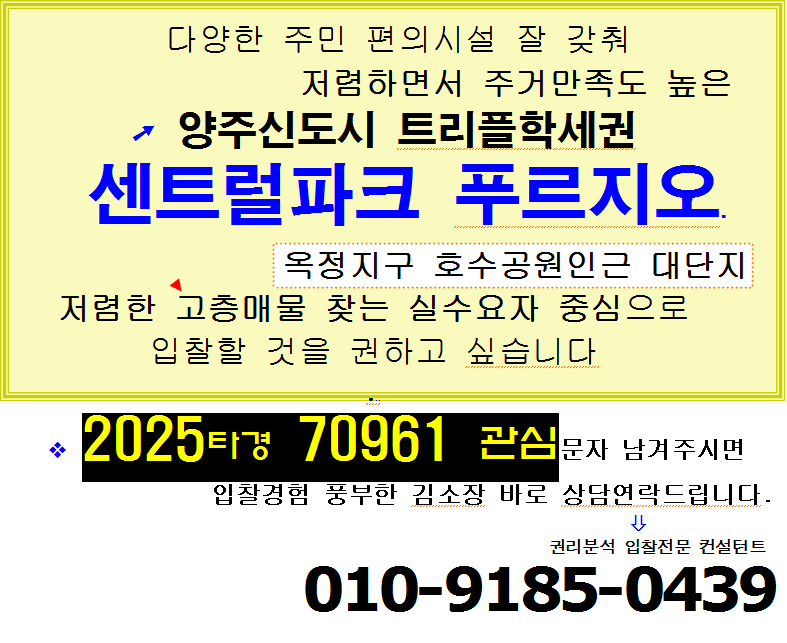 노란궁뎅이 2025. 9. 14. 19:04양주신도시 트리플학세권아파트. 옥정동 센트럴파크 푸르지오 24평형 고층 2차경매(24-70961)925