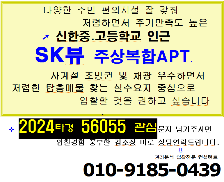 평택시 학세권 고층아파트 . 합정동 SK뷰 주상복합 51평형 탑층 매물 3차경매(24-56055)1013 본문