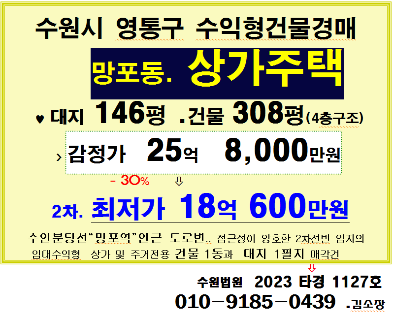 수원시 망포역인근 임대수익형건물 . 영통구 망포동 4층구조 상가주택 2차경매(23-1127)1029
