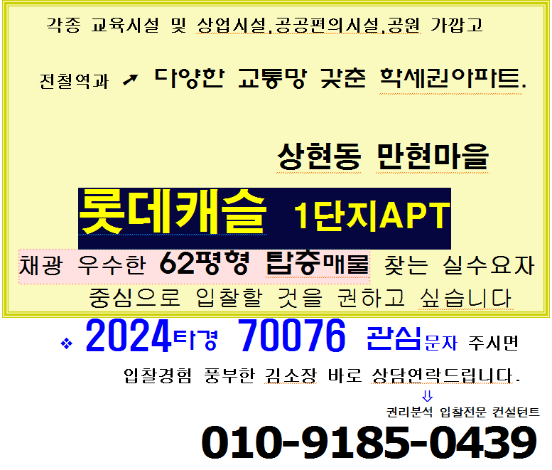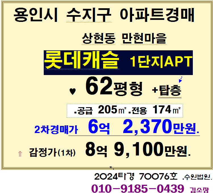 노란궁뎅이 2025. 10. 2. 19:59용인 수지구 학세권아파트. 상현동 상현마을 롯데캐슬1단지 탑층 62평형 2차경매(24-70076)1028