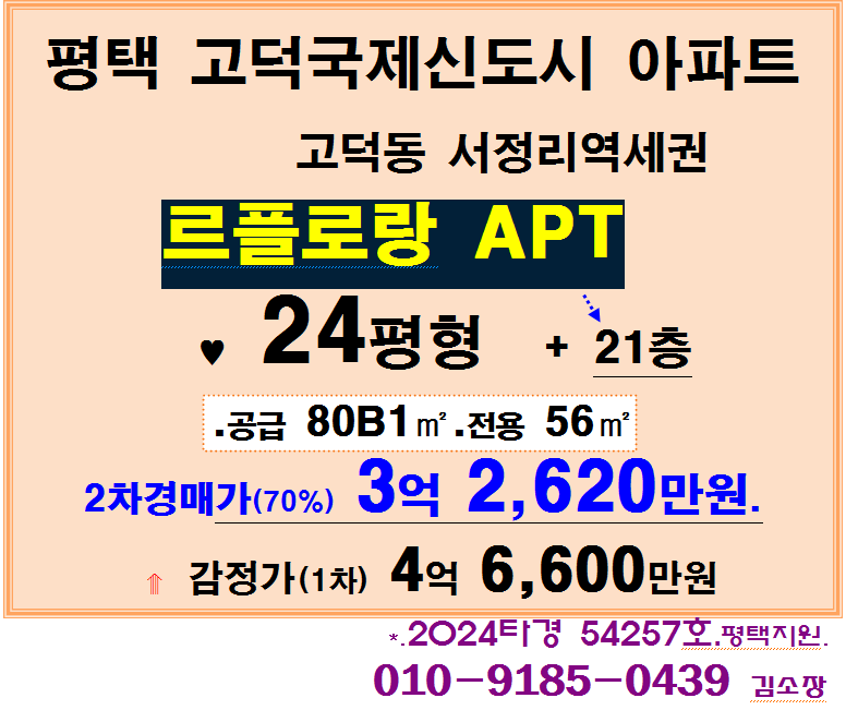 | 평택 고덕국제신도시아파트. 삼성전자 인근 대광 로제비앙 디아트 33평형 2차경매(24-53988)1021 (0) | 2025.10.05 |