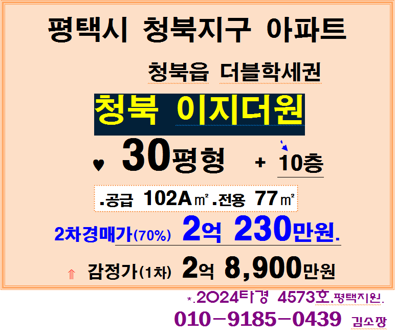 평택 청북지구 더블학세권아파트. 청북 이지더원APT 30평형 중층 2차경매(24-4573)1021