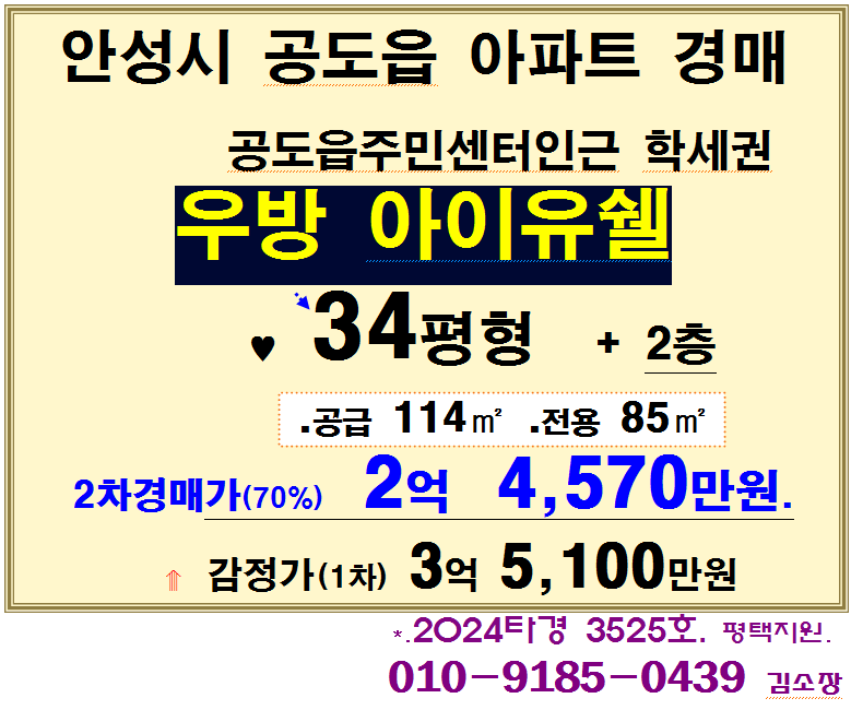 노란궁뎅이 2025. 10. 7. 15:57안성 공도아파트. 공도읍행정복지센터 인근 공도 우방 아이유쉘 34평형 2차경매(24-3525)1028