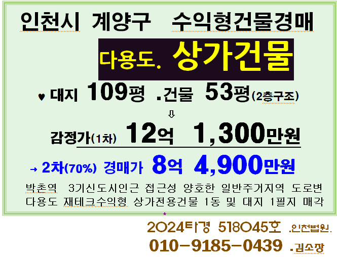 인천 계양구 수익형 건물경매. 박촌역 3기신도시 인근 2층구도 상가건물 2차경매(24-518045)1117 본문