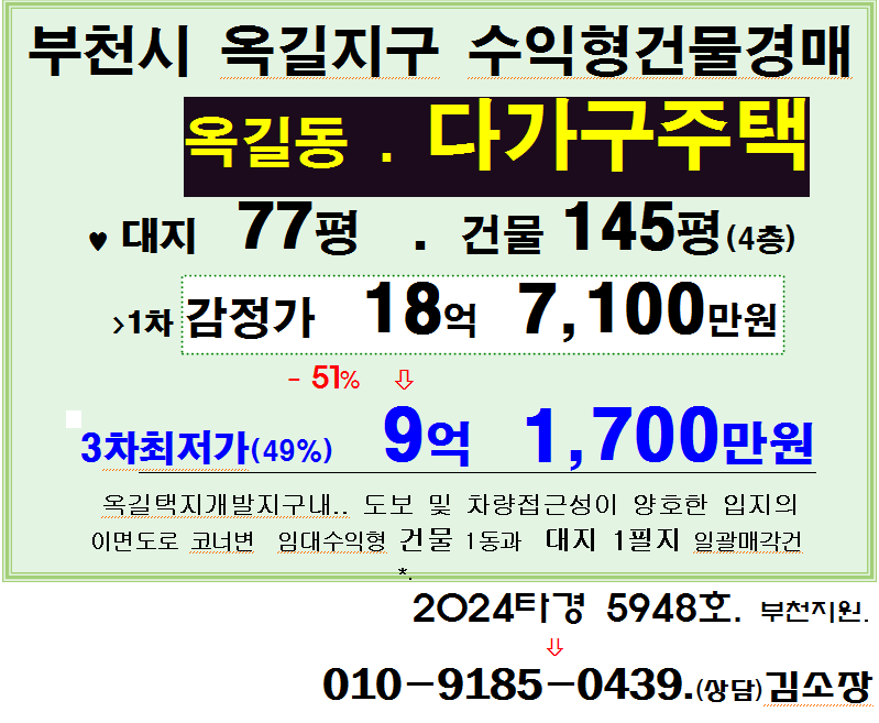 부천 옥길지구 수익형건물. 소사구 옥길동 4층구조 다가구건물 3차 반값경매(24-5948)1211 본문