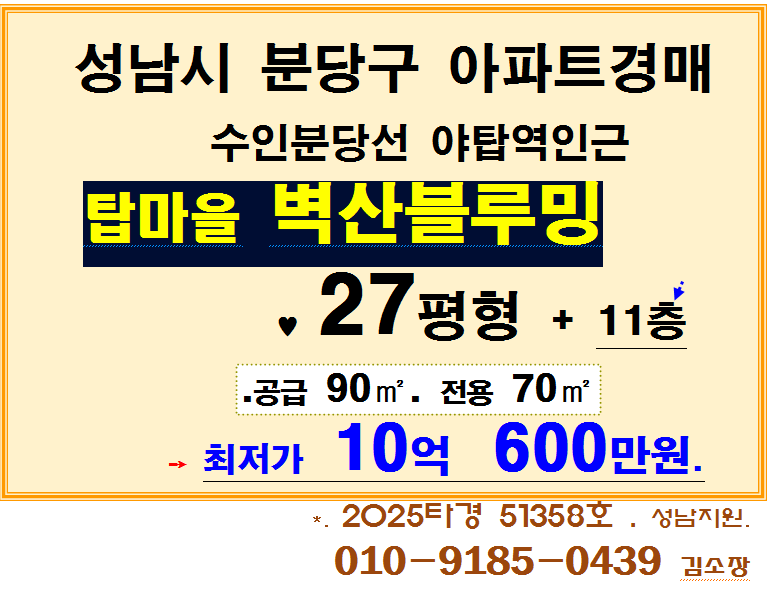 노란궁뎅이 2025. 10. 30. 12:36성남시 분당구 역세권아파트. 야탑역인근 탑마을 벽산블루밍 27평형 경매(25-51358)1110