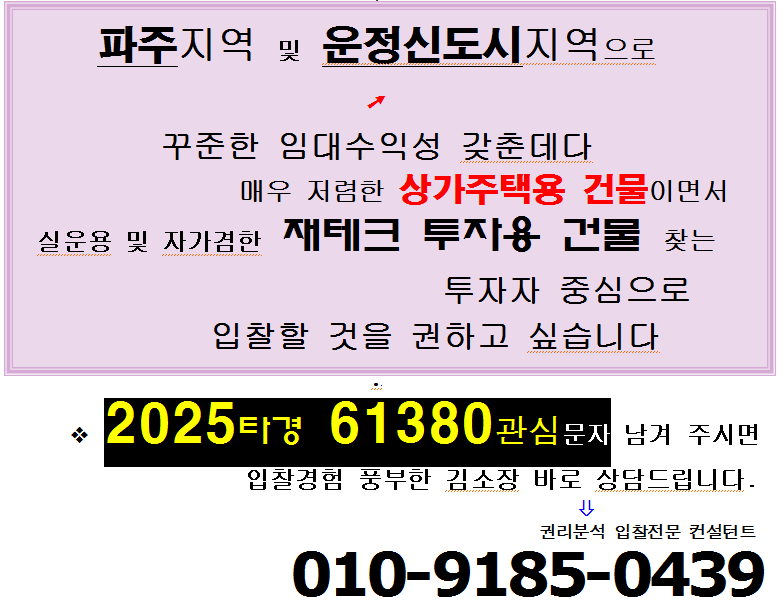 | 수원농수산물시장인근 수익형건물. 권선구 권선동 3층구조 상가주택 3차 반값경매(2024-71482)1124 (0) | 2025.11.03 |