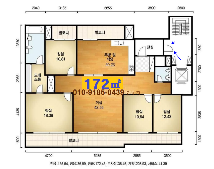 방 4개.드레스룸, 욕실 겸 화장실 2개