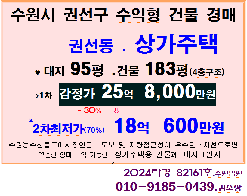 수원 권선동 수익형건물. 농수산물도매시장인근 도로변 상가주택용 4층건물 2차경매(24-82161)1219