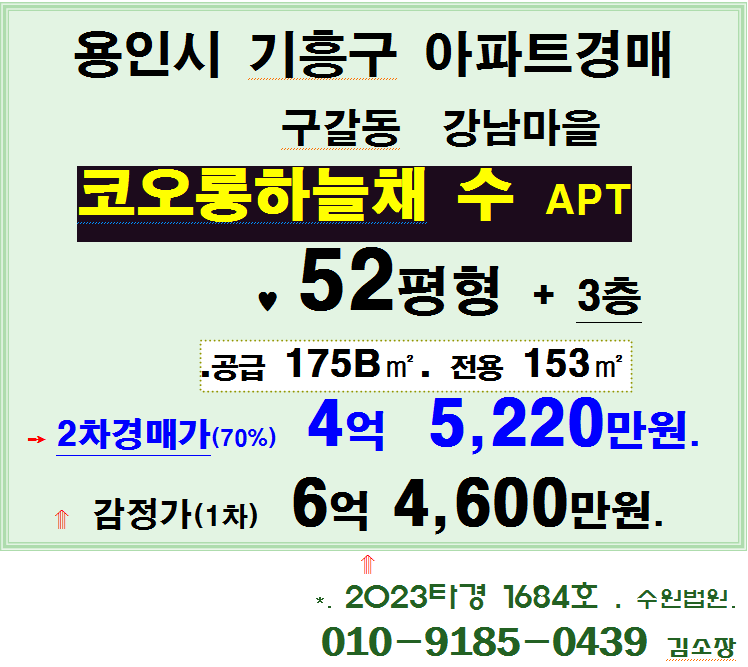 노란궁뎅이 2025. 11. 30. 11:04용인 강남대인근 학세권아파트. 구갈동 강남마을 코오롱하늘채 수 APT 52평형 2차경매(23-1684)1212