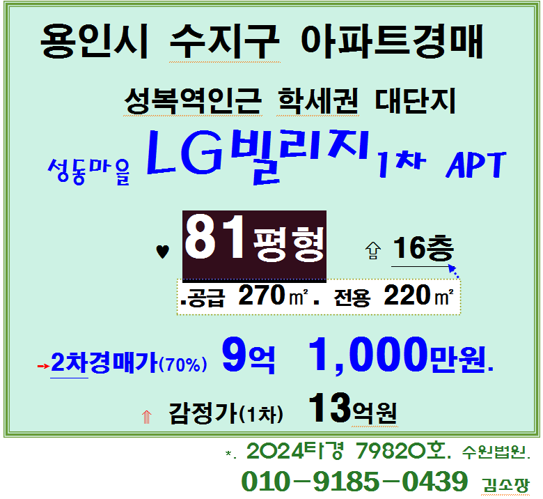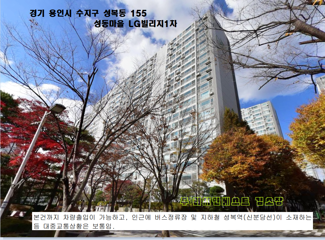 용인 수지구 중대형아파트. 성복역인근 성동마을 LG빌리지 1차 81평형 고층 2차경매(24-79820)107 본문