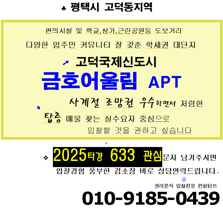 노란궁뎅이 2025. 12. 25. 11:36평택고덕국제신도시 학세권아파트. 고덕동 금호어울림 APT 24평형 탑층 2차경매(25-633)0119