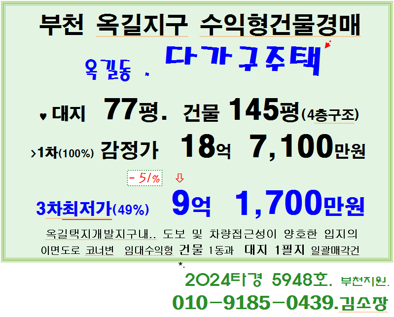 부천 옥길지구 다가구건물 반값경매. 소사구 옥길동 4층구조 수익형 다가구주택 3차경매(24-5948)0127 본문