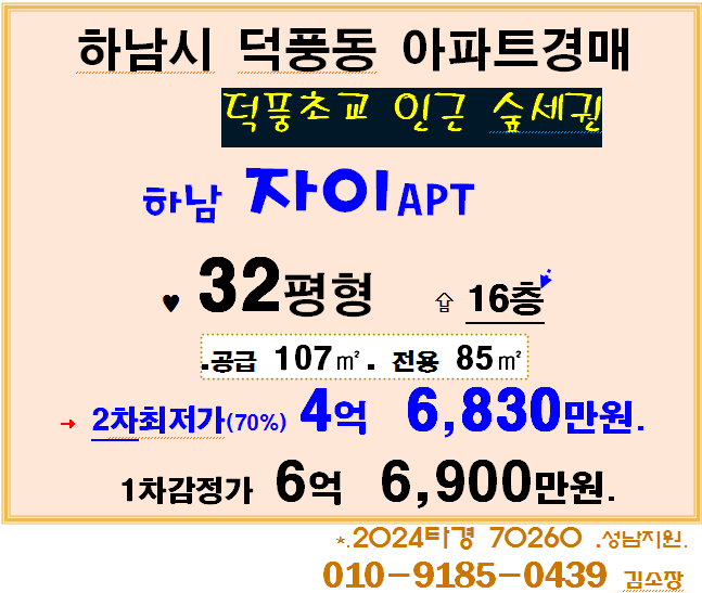 | 하남시 역세권대단지아파트 . 창우동 트리플학세권 꿈동산 신안APT 32평형 2차경매(24-6948)0119 (0) | 2026.01.03 |