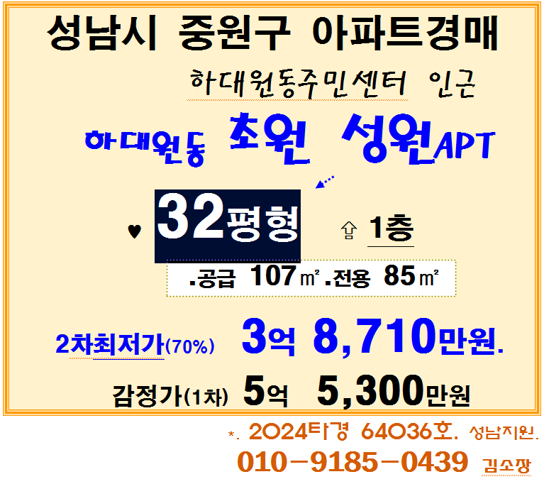 노란궁뎅이 2026. 1. 8. 14:07성남시 중원구 트리플학세권아파트. 하대원동 초원 성원APT 32평형 2차경매(24-64036)0126