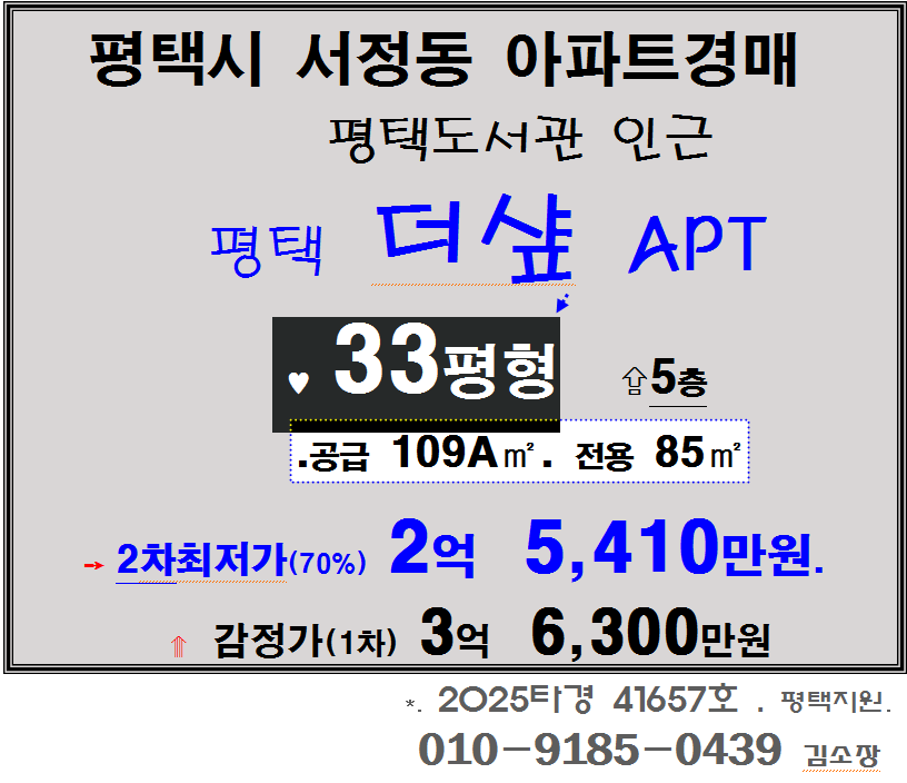 노란궁뎅이 2026. 1. 12. 12:12평택시 서정동 대단지아파트. 평택도서관 인근 평택 더샾 33평형APT 2차경매(25-41657)0126