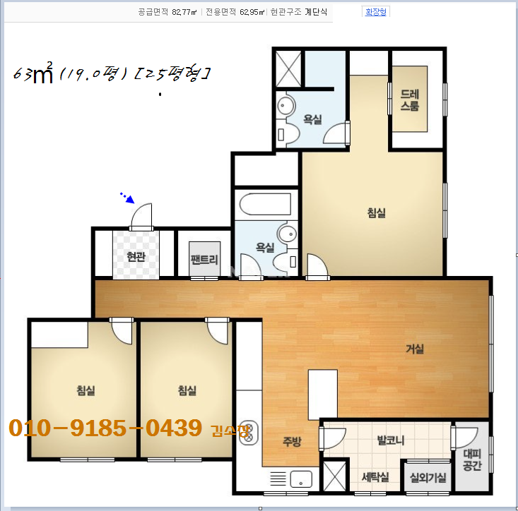 방 3 ,드레스룸 ,욕실겸 화장실 2
