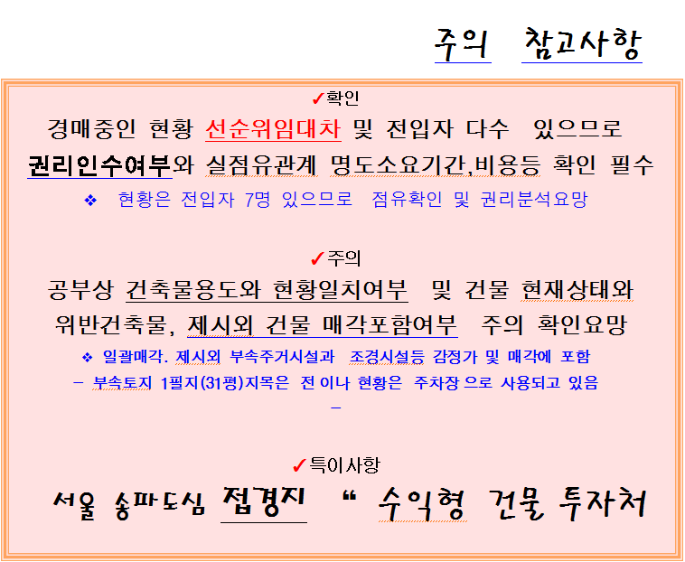 | 수원시 영통구 신동지구 건물매각. 신동 4층구조 임대수익형 상가주택 2차경매(23-11834)0310 (0) | 2026.01.30 |