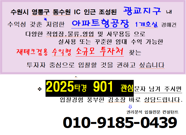 노란궁뎅이 2026. 2. 7. 19:17수원광교지구 지식산업센터 반값매각 .이의동 에이스광교타워3 아파트형공장 22평 3차경매(25-901)220