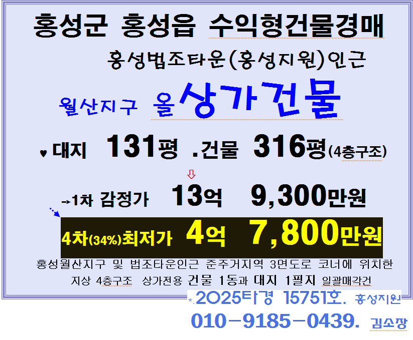 | 홍성군 수익형 상가건물 반값경매. 홍성지원인근 월산지구 도로변 올상가건물 3차경매(25-15751)303 (0) | 2026.02.18 |