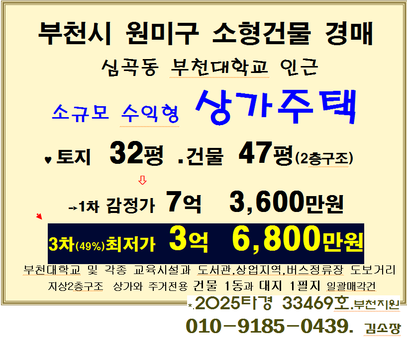 부천 원미구 소형 상가주택 반값매각.부천대학교 인근 소규모 상가주택용 건물 3차경매(25-33469)0414