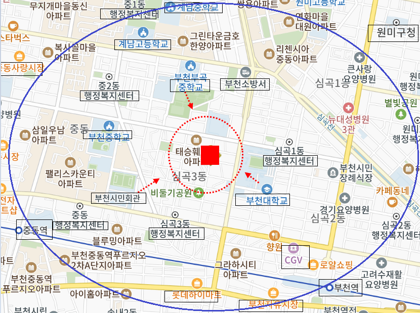 각종 교육시설,도서관,각종 상가와 부천소방서