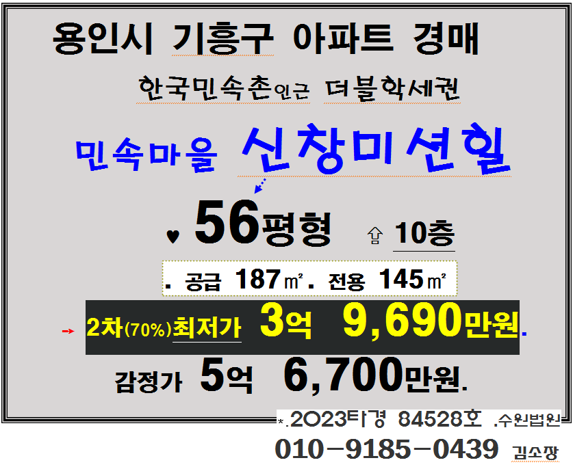 용인 한국민속촌인근 더블학세권아파트. 보라동 민속마을 신창미션힐APT 56평형 2차경매(23-84528)401