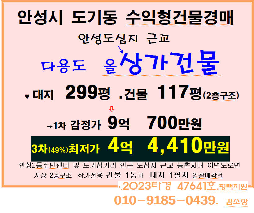 안성도심지 근교 올상가건물 반값매각. 도기동 2층 상가건물 대지 299평 경매(23타경47641)413 본문