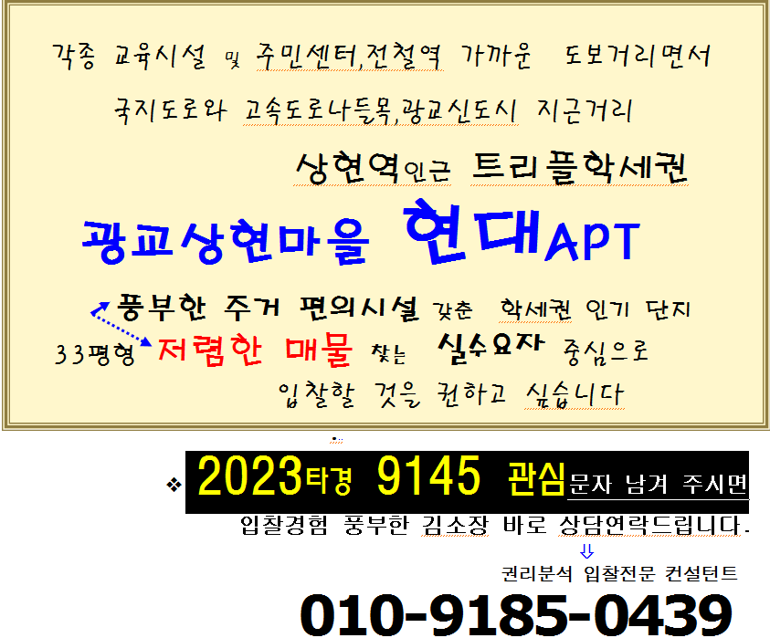 노란궁뎅이 2026. 3. 27. 20:20용인시 수지구 트리플학세권아파트. 상현역 광교상현마을 현대APT 33평형 경매(23타경9145)0415