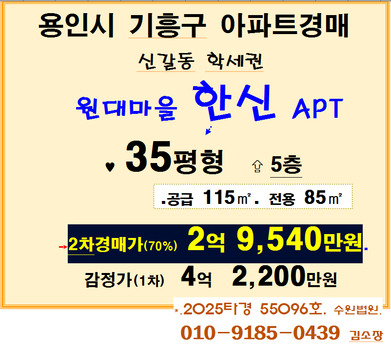 용인시 기흥구 학세권아파트 매각 . 신갈동 원대마을 한신 APT 35평형 경매(25타경55096)422 본문