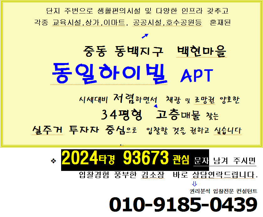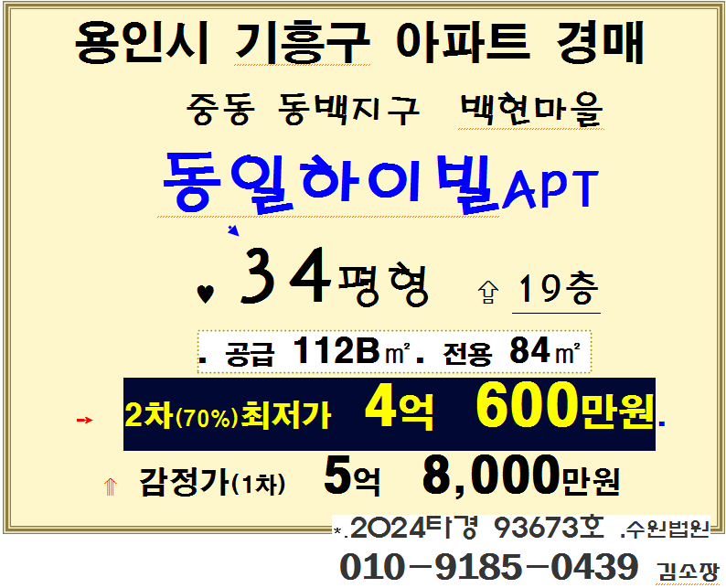 노란궁뎅이 2026. 4. 2. 15:12용인시 동백지구아파트 매각. 기흥구 중동 백현마을 동일하이빌APT 34평형 고층경매(24타경93673)421