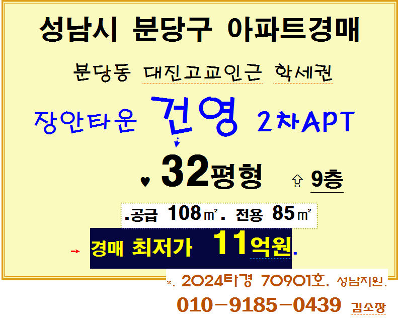 노란궁뎅이 2026. 4. 3. 14:33성남 분당구 학세권아파트 . 분당동 대단지 장안타운 건영 2차APT 32평형 경매(24타경70901)0420