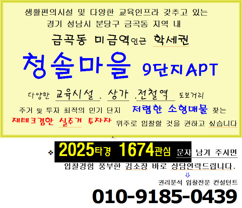 성남 분당구 미금역인근 학세권 소형아파트. 금곡동 청솔마을 9단지APT 18평형 중층경매(25타경1674)420 본문