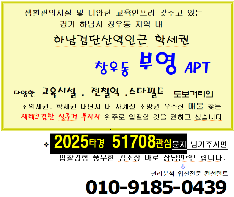 하남시 초역세권 학세권아파트. 검단산역 창우동 부영 APT 20평형 탑층 경매(25타경51708)0601 본문