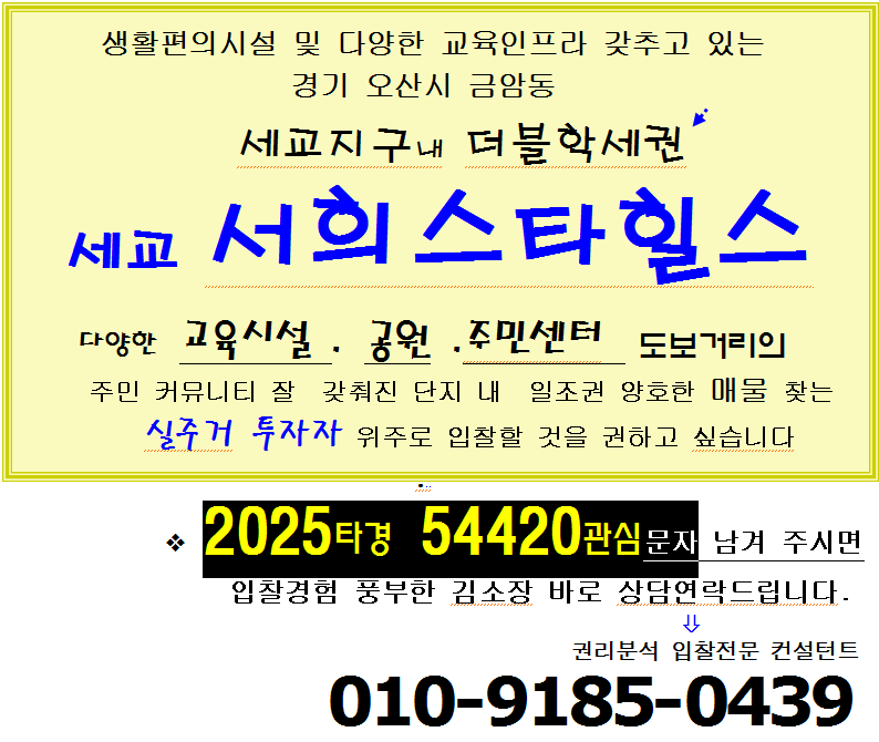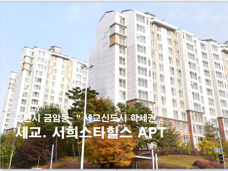 노란궁뎅이 2026. 4. 6. 10:31오산시 세교지구 더블학세권아파트. 금암동 세교 서희스타힐스APT 33평형 경매(25타경54420)0421